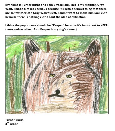“This is my Mexican Gray Wolf. I made him look serious because it’s such a serious thing that there are so few Mexican gray wolves left. I didn’t want to make him look cute because there is nothing cute about the idea of extinction. I think the pup’s name should be Keeper” because it’s important to KEEP these wolves alive.”